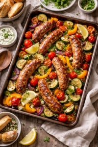 Sheet pan sausage and vegetables is a practical Mediterranean-style dinner that feels hearty, colorful, and very easy to prepare. Sausage roasts alongside zucchini, peppers, onions, and tomatoes, allowing the vegetables to caramelize while absorbing savory flavor from the pan. A drizzle of olive oil, garlic, and oregano pulls everything together with very little effort. The final tray feels rustic, balanced, and perfect for evenings when you want dinner with almost no cleanup.